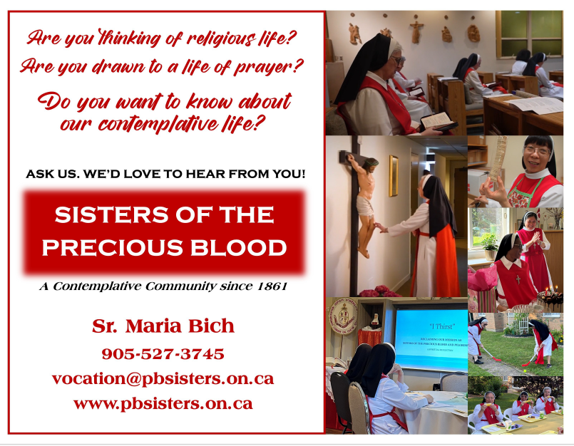The Sisters Adorers of the Precious Blood, a community of Contemplative Sisters, have been present in the Diocese of Hamilton since 1946. In addition to their ministry of prayer, they produce altar breads for many of our Parishes. You are welcome to contact them if you are interested in exploring a vocation to the Contemplative way of life. Sisters of the Precious Blood