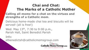 Calling all moms for a chat on the virtues and strengths of a Catholic mom. Delicious home made chai tea and biscuits will be served! (all is free!)