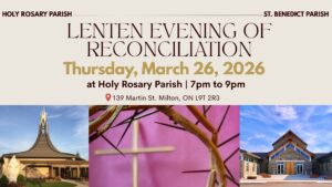 On Thursday, March 26th , there will be a communal celebration of the Sacrament of Reconciliation for both parishes in Milton. It will take place at Holy Rosary Parish (139 Martin St. ) at 7pm. Several priest confessors from the region will be available for the celebration of the individual confessions at that time. Please do not wait until the last minute to celebrate the Sacrament. Reconciliation is a wonderful way to prepare ourselves for the celebration of Easter