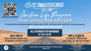 The Couples for Christ (CFC) community and its Family Ministry whose “Mission” is “Building the church of the home”, Building the church of the poor” and “Vision” of “Families in the Holy spirit Renewing the Face of the earth”, are delighted to invite you to join us in our CFC Christian Life program (CLP), a transformative journey designed to deepen your faith, enrich your spirit, and build a loving community.