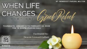 When Life Changes – Part One – Has someone you cared about died? Are you grieving the loss of the person’s presence in your life? Are you looking for relief from the feelings associated with the loss of this loved one? You are not alone! The Hamilton Diocese offers a six-week grief program for your support. Facilitated by Deacon Leonard Gallant, part one of the program will be offered on Thursdays from January 8th to February 12th from 7:00-8:30pm and will be held at St. Benedict Parish Hall, at 300 Yates Drive, Milton, ON