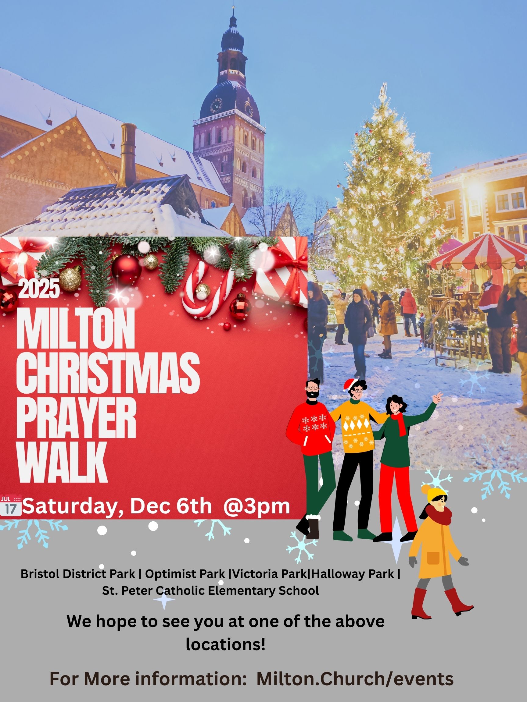 The churches of Milton are holding an outdoor community Christmas Prayer Walk on Saturday, December 6th at 3pm. Together we want to pray that the people of Milton would know the Wonderful Counsellor, Prince of Peace, Mighty God, Everlasting Father that is spoken of in Isaiah 9.